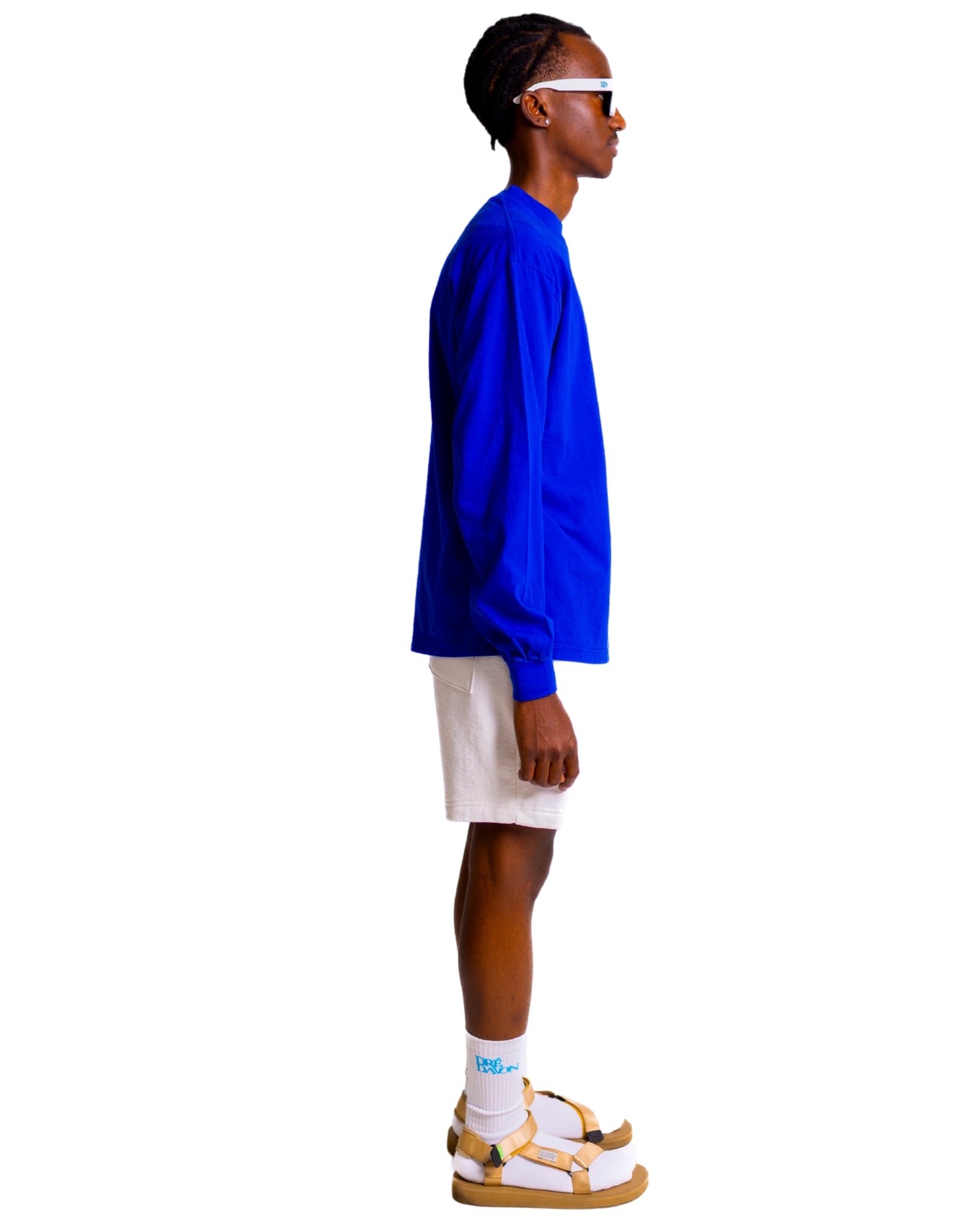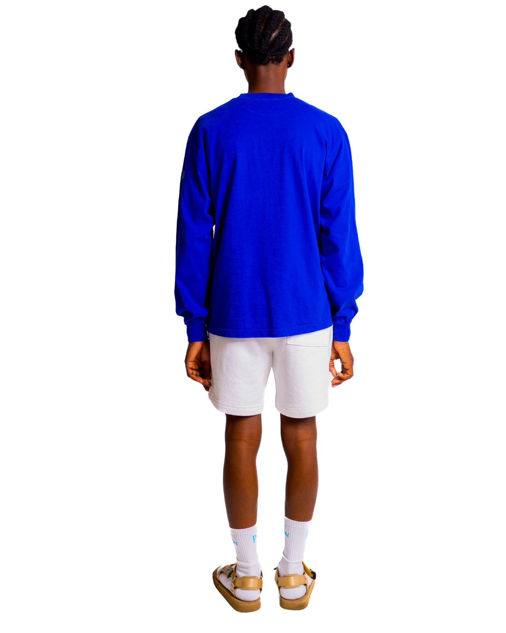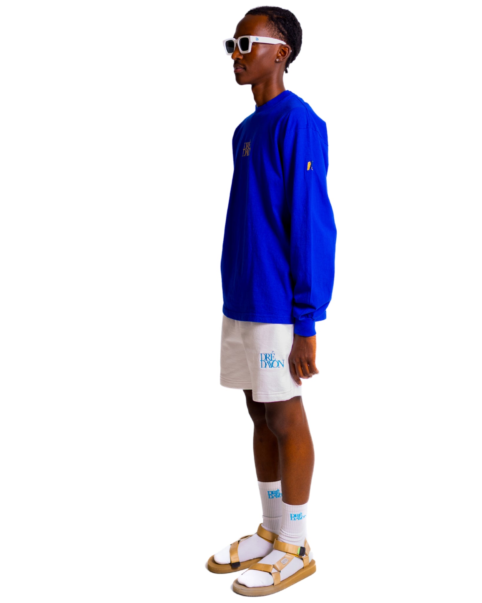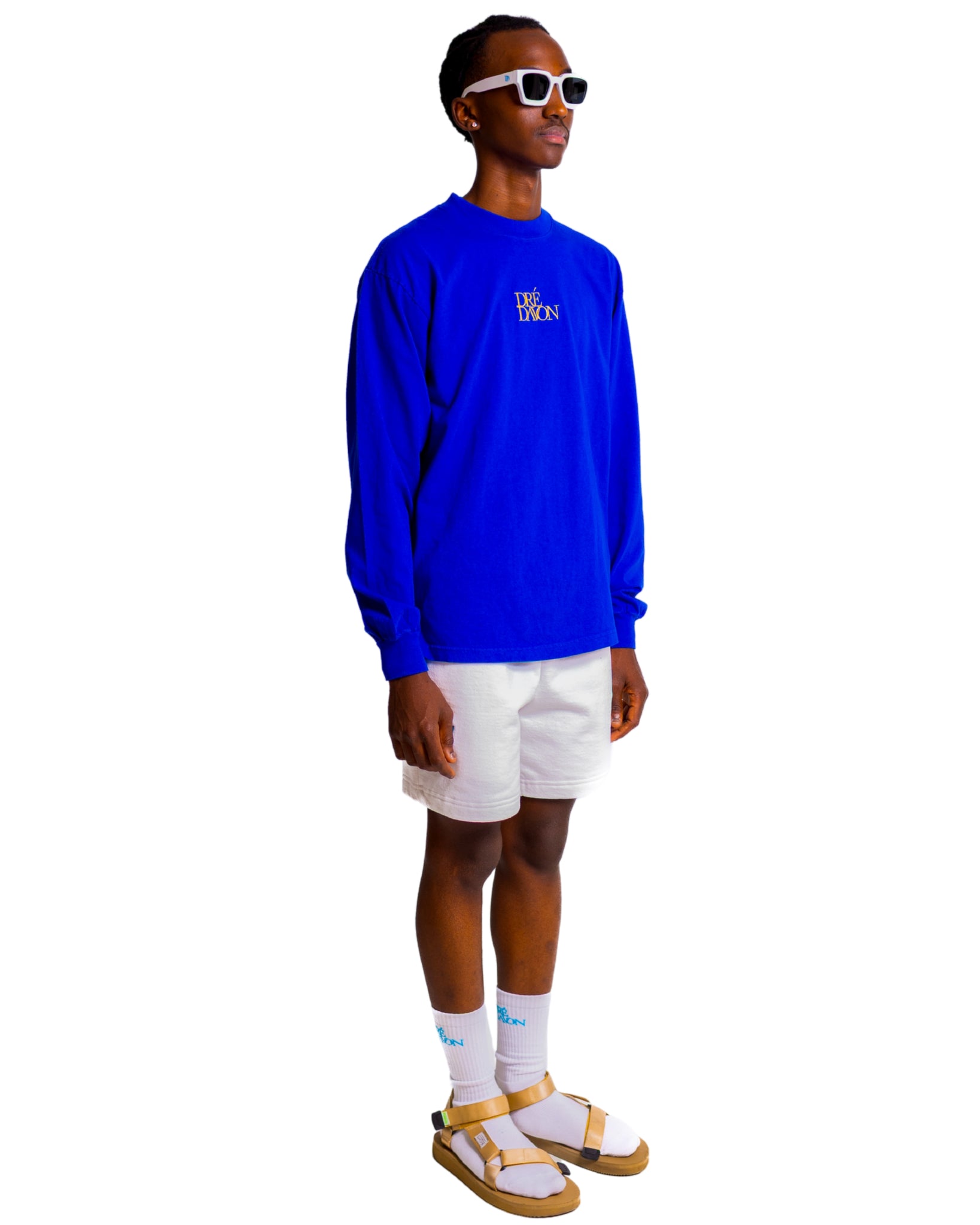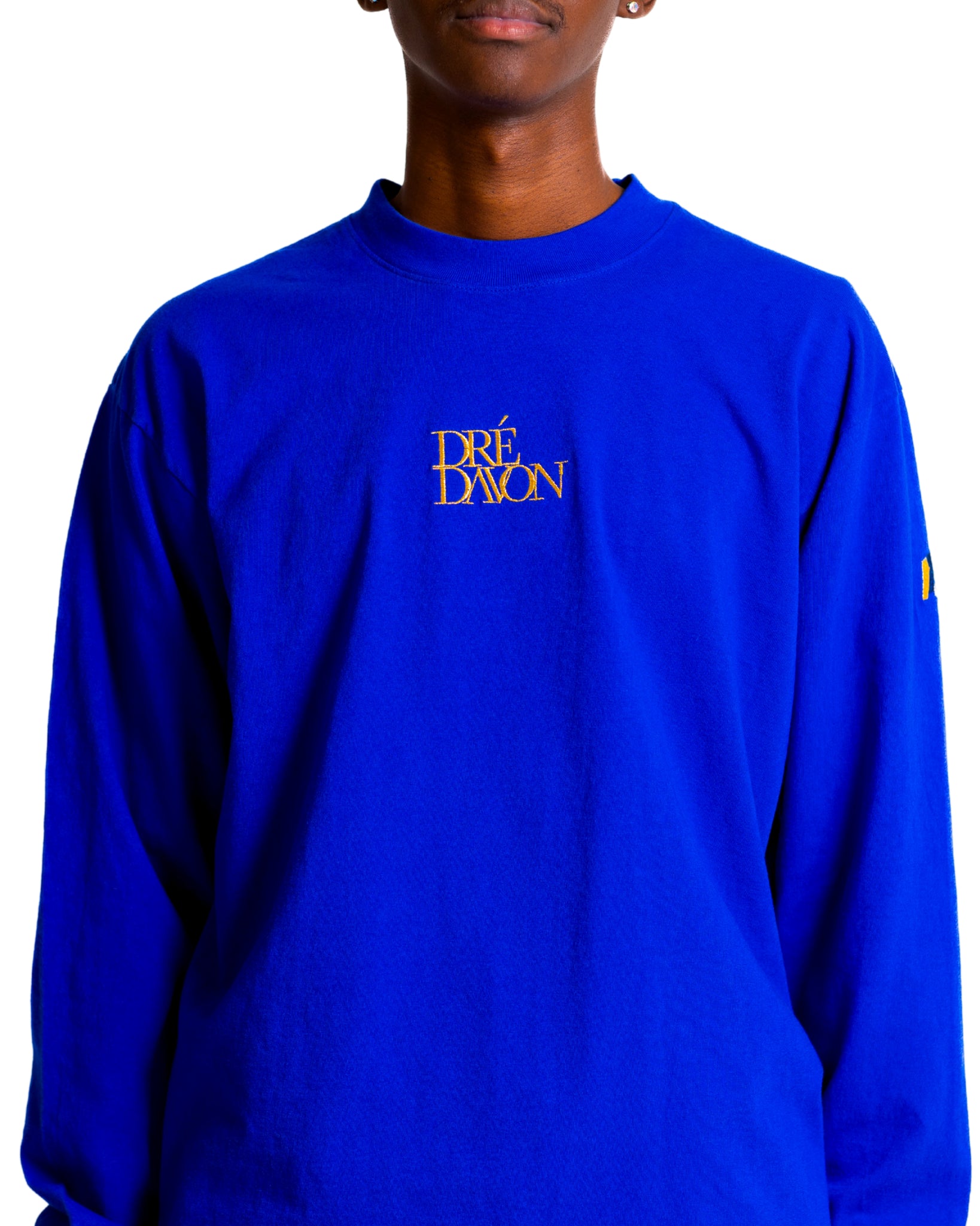Long sleeve heavyweight cotton T-shirt in Zaffre Blue. High crewneck line. Dré Davon signature logo graphic embroidered in metallic gold at chest, signature color patch embroidered on left sleeve. The garment is washed with natural enzymes, resulting in a broken-in feel which is also shrink free as a result of garment dyeing.