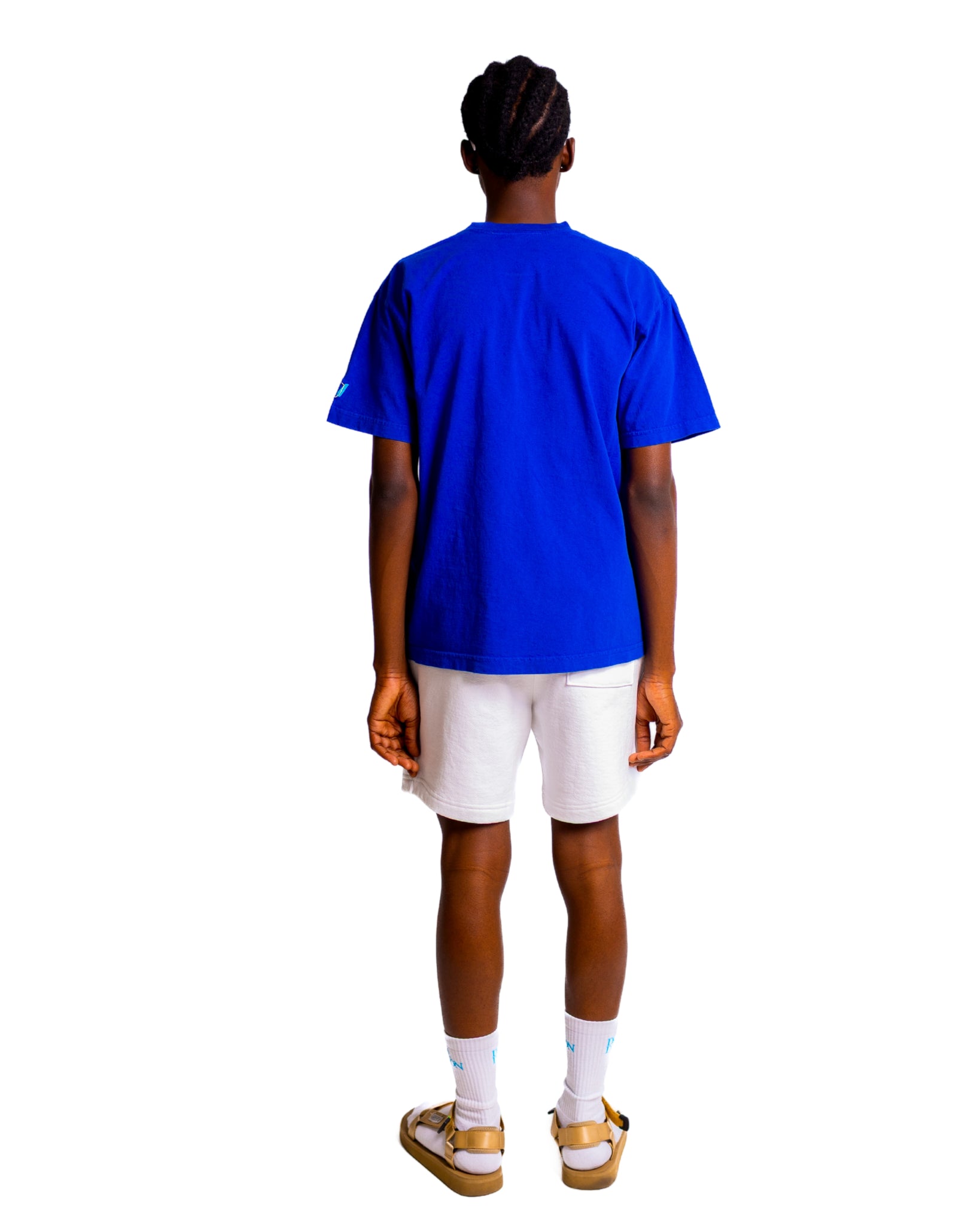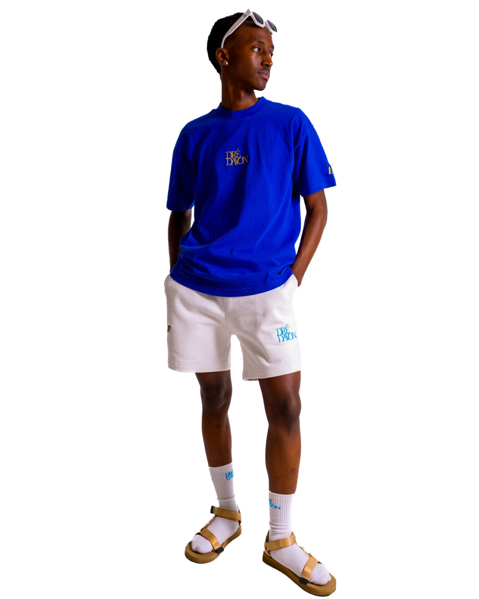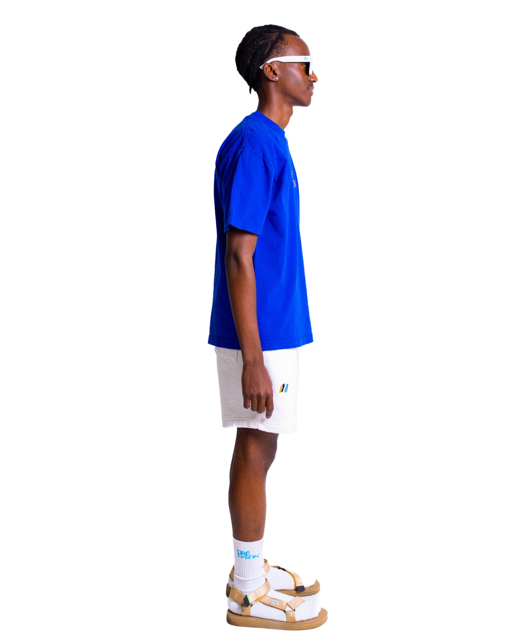 Short sleeve heavyweight cotton T-shirt in Zaffre Blue. High crewneck line. Dré Davon signature logo graphic embroidered in metallic gold at chest, signature color patch embroidered on left sleeve. The garment is washed with natural enzymes, resulting in a broken-in feel which is also shrink free as a result of garment dyeing.