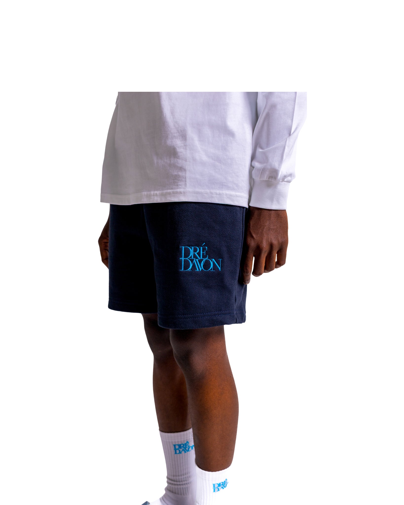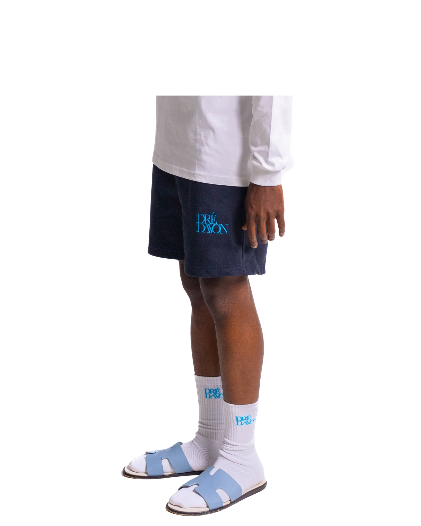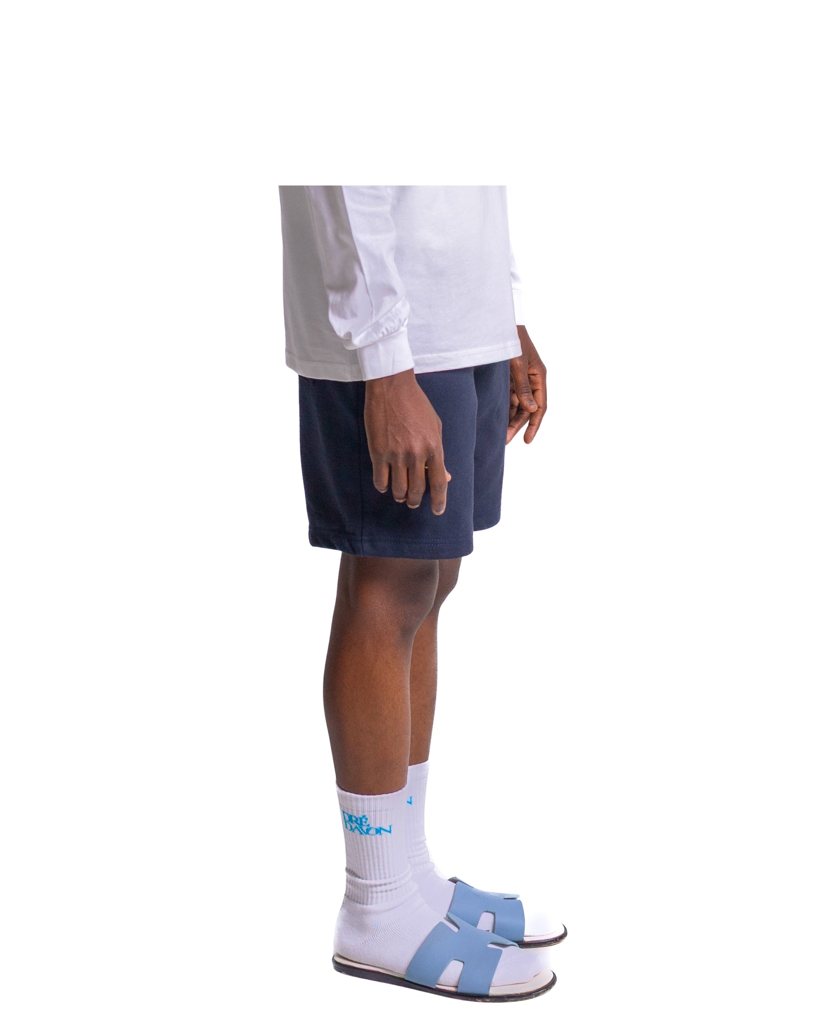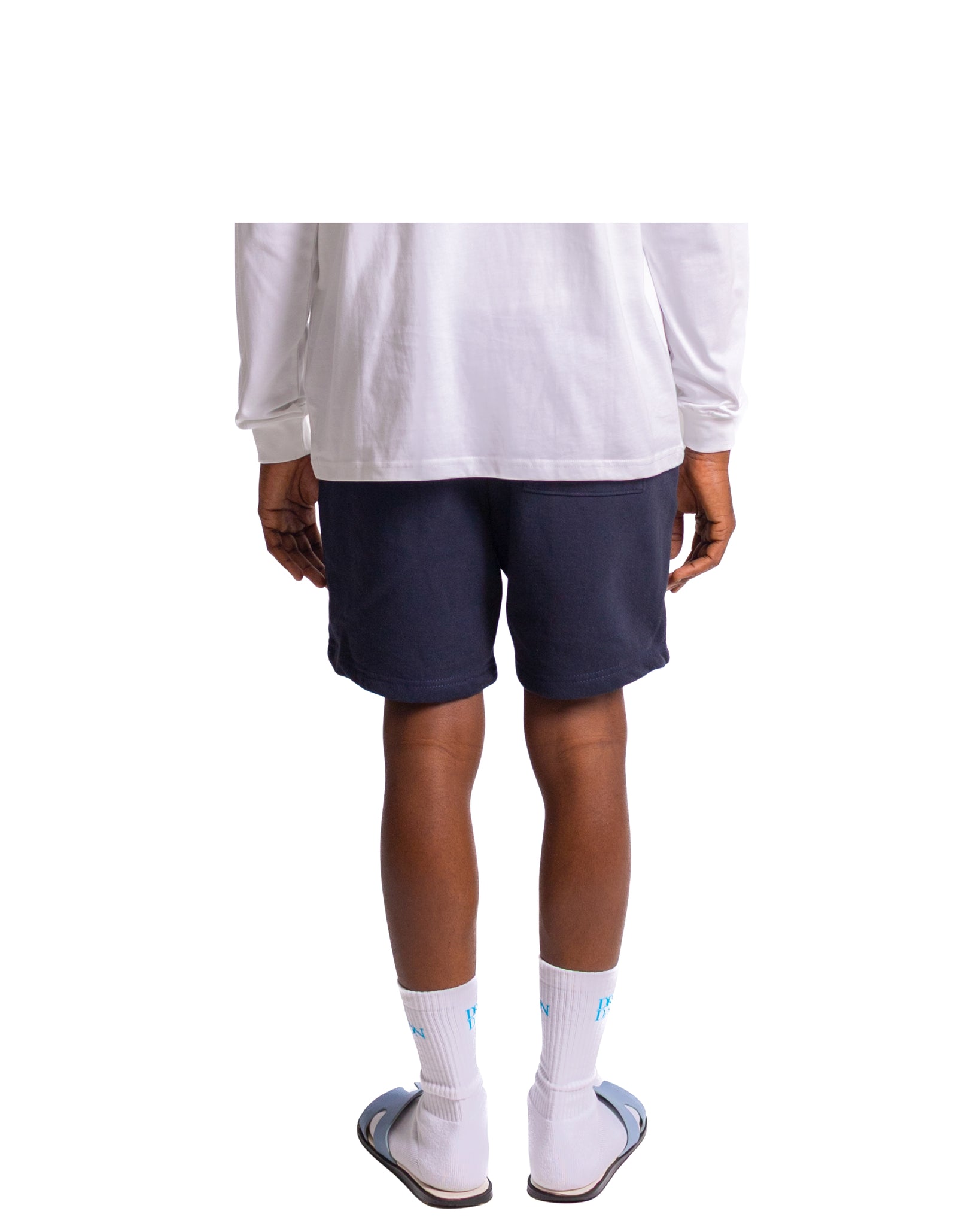 100% 14 oz heavyweight cotton shorts in Navy. Embroidered capsule logo in metallic Cyan at front, signature color patch embroidered at the front. Elastic waistband & drawstring. Side front pockets, single back pocket. Relaxed fit.