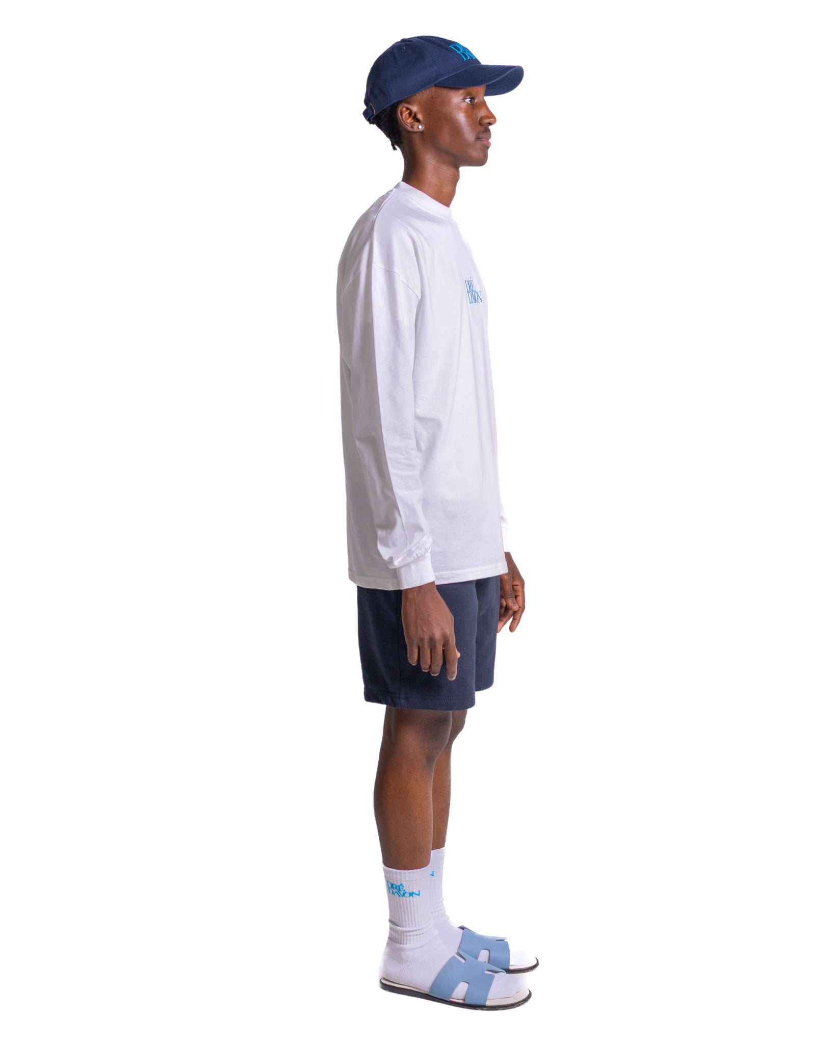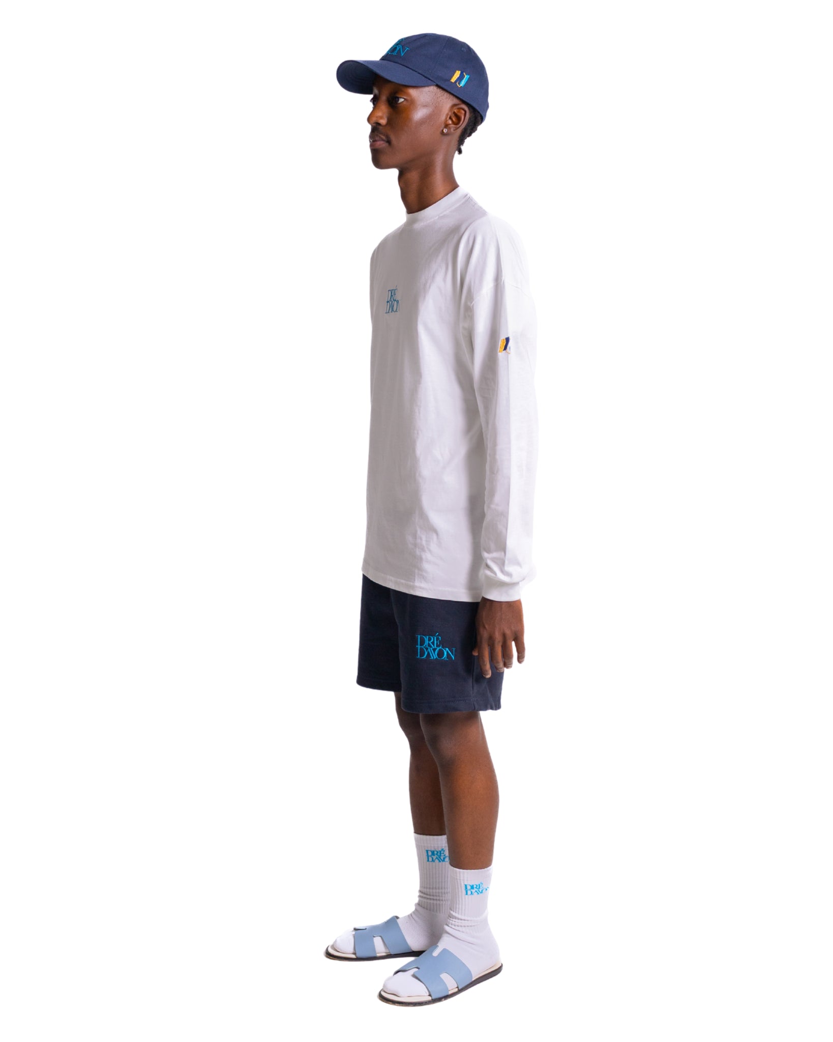 Long sleeve heavyweight cotton T-shirt in White. Crew neck neck ribbing. Dré Davon signature logo embroidered in metallic Cyan blue at chest, signature color patch embroidered at left sleeve. Longer body with cuffed sleeves. Slight drop at back. Side seamed, shoulder to shoulder tape, double needle bottom hem. Preshrunk to minimize shrinkage.
