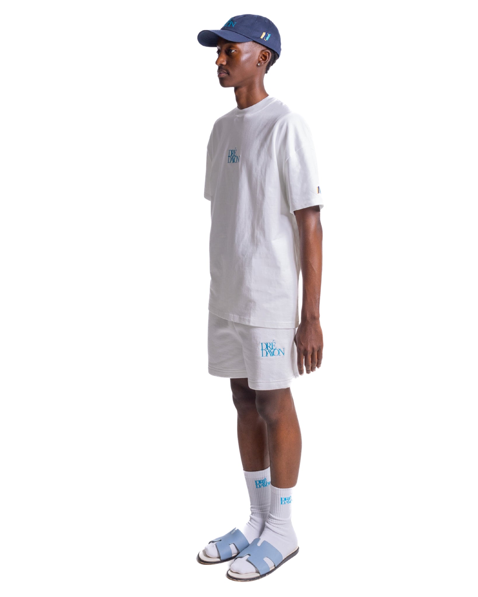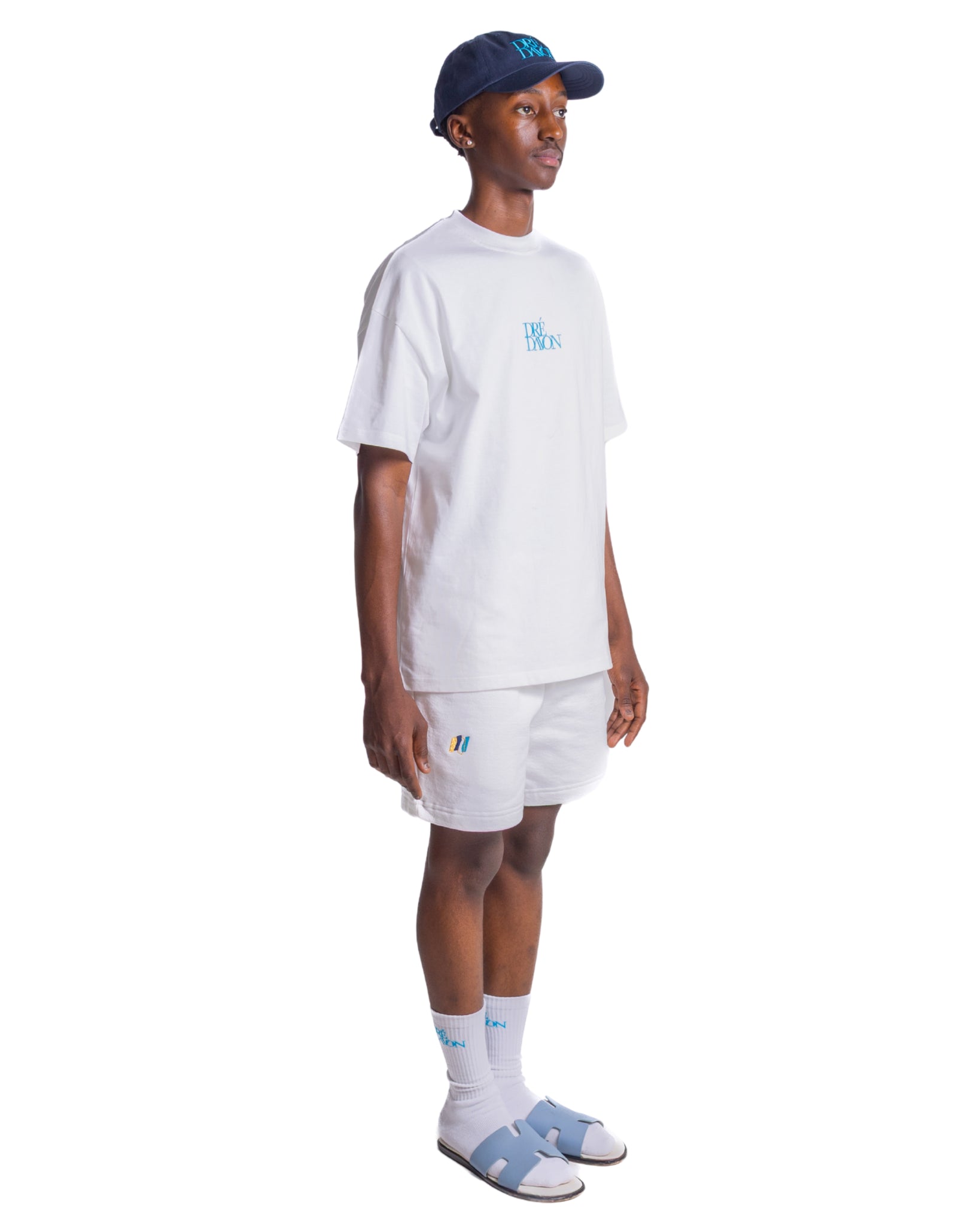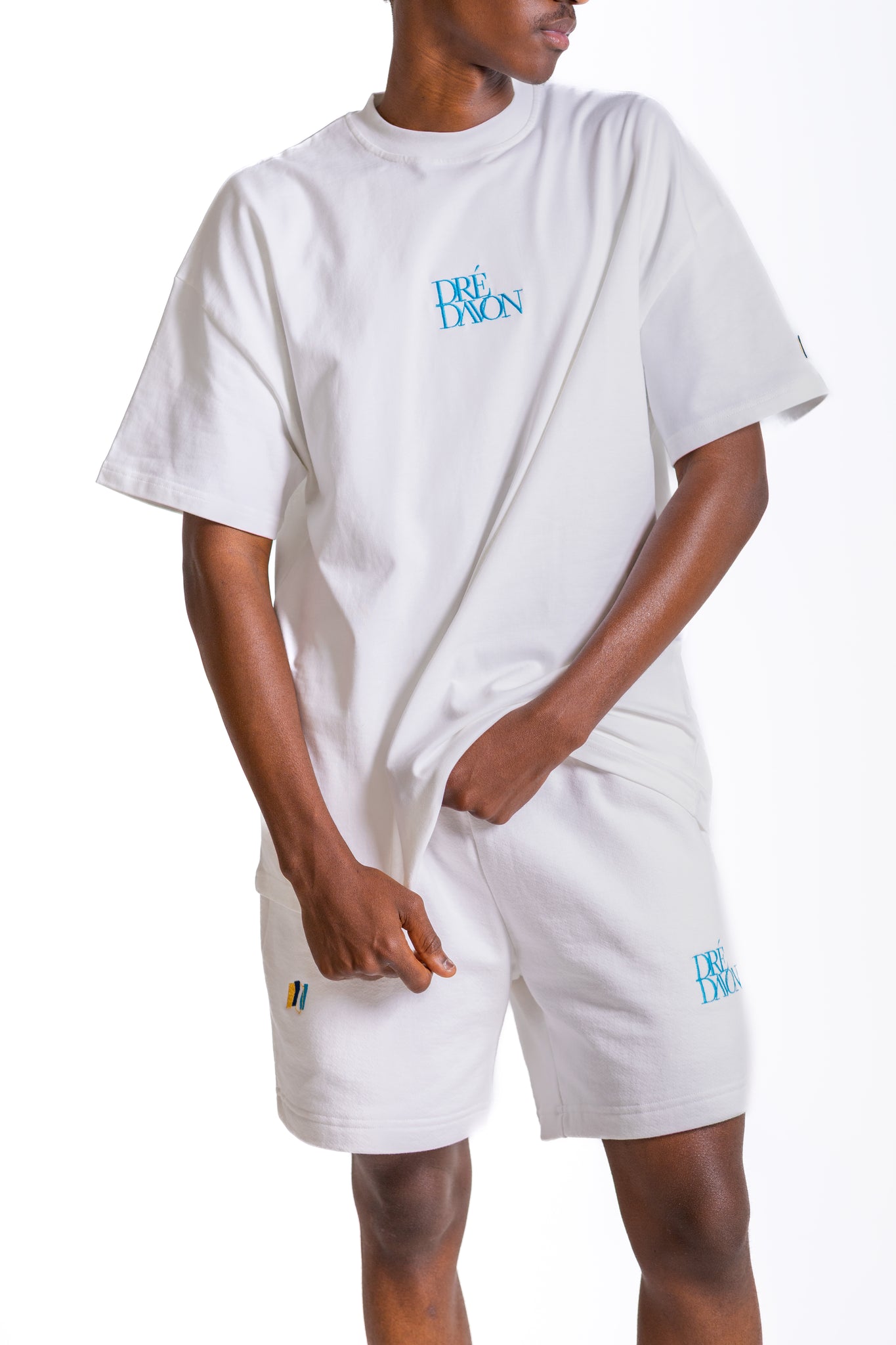 Short sleeve heavyweight cotton T-shirt in White. Crew neck neck ribbing. Dré Davon signature logo embroidered in metallic Cyan blue at chest, signature color patch embroidered at left sleeve. Longer body with cuffed sleeves. Slight drop at back. Side seamed, shoulder to shoulder tape, double needle bottom hem. Preshrunk to minimize shrinkage.
