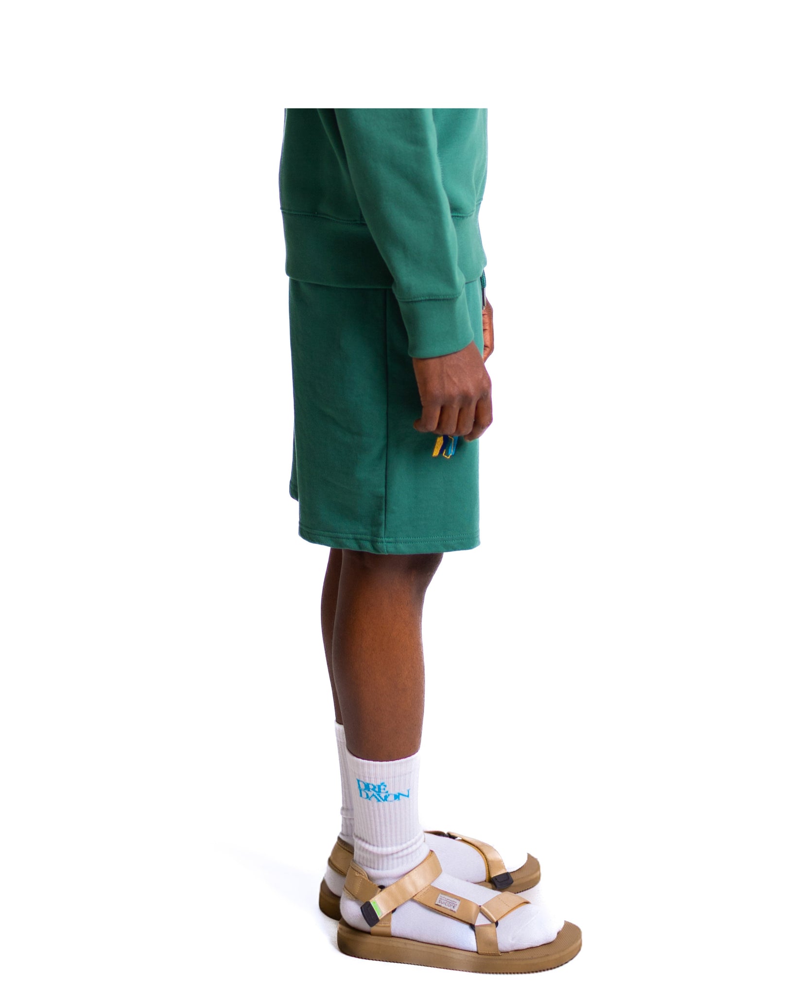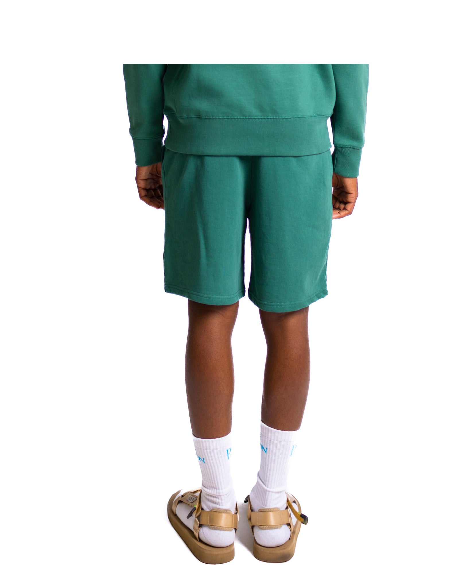 100% Organic cotton shorts in Emerald with brushed interior. 100% Organic Cotton facing. Embroidered capsule logo in metallic white at front. Adjustable drawstring waist to adjust fit. Bartacked corners of front pockets, elastic hems. Standard fit.